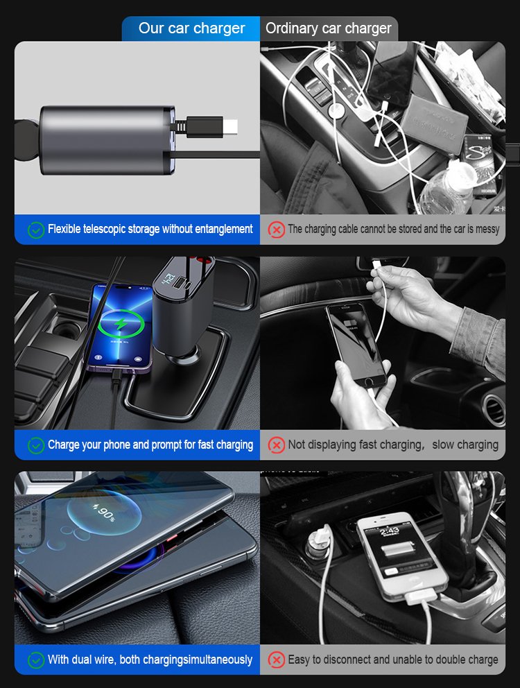 Restez organisé et connecté sans effort grâce à nos doubles cordons de charge rétractables innovants, qui offrent des adaptateurs Lightning et USB-C pour simplifier votre expérience de charge tout en gardant votre voiture sans encombrement.